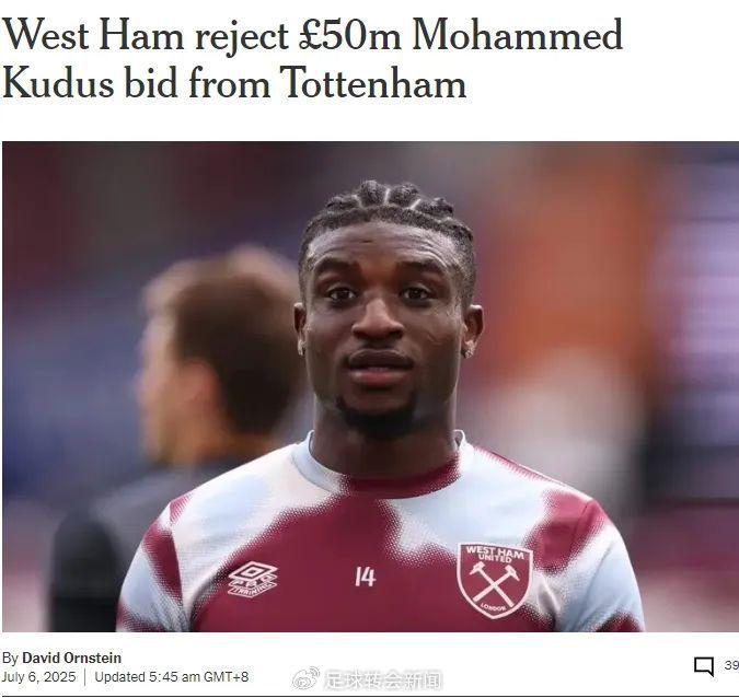 TA记者DO发文,热刺在周六晚为库杜斯提交了5000万英镑的报价,这份报价已经被西汉姆拒绝,不过俱乐部之间的谈判仍在继续。