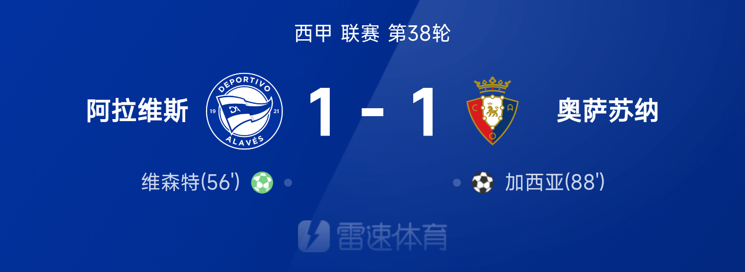 全场比赛结束,奥萨苏纳客场1-1战平阿拉维斯,无缘下赛季欧战。